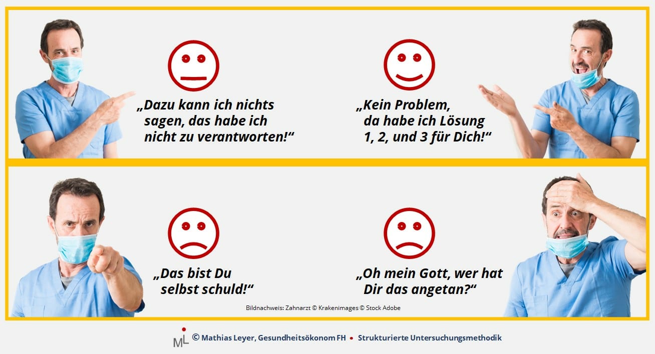 - Der Behandler ignoriert die eigentliche Frage des Patienten, bietet dafür (wie aus der Pistole geschossen) eine Problemlösung an: “Kein Problem, das können wir reparieren/neu machen.